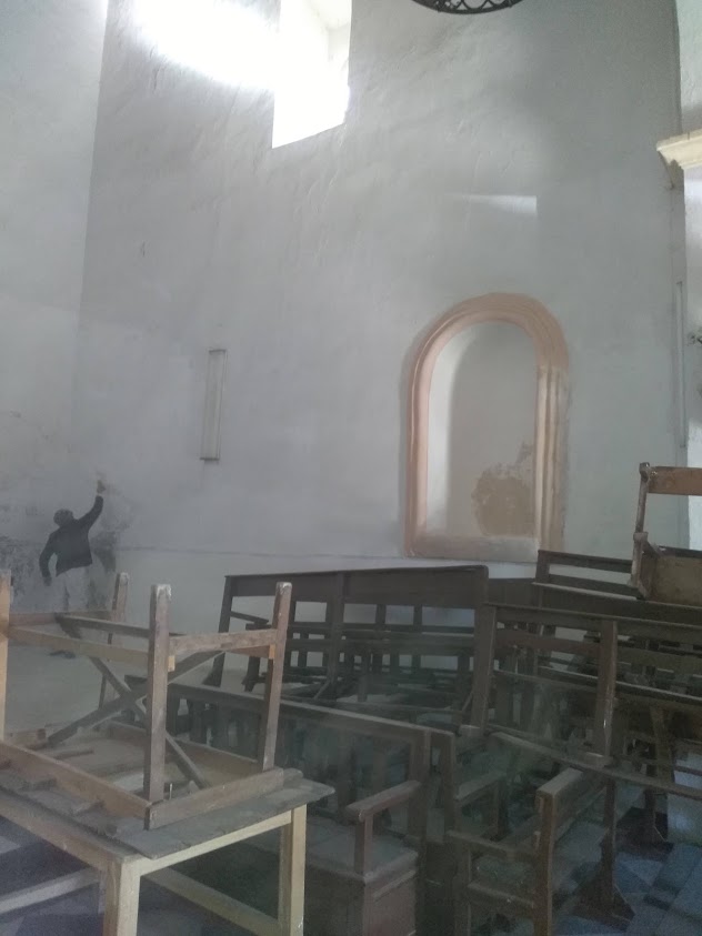 El 4 de Febrero del 2019 entraron los pintores y se procedió a pintar las paredes, hasta el techo, de toda la nave, incluyendo la limpieza y pintura del techo de la entrada y barandilla del coro.