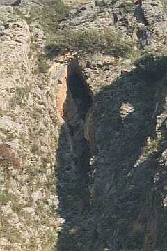 La anterior imagen es una vista del Cerro de los Riscos y de la Cueva de las Palomas (es la situada sobre las cabezas de Pedro y Pilar) tomada desde el Tajo del Águila, siendo la fotografía de la derecha un detalle de la entrada a la misma.